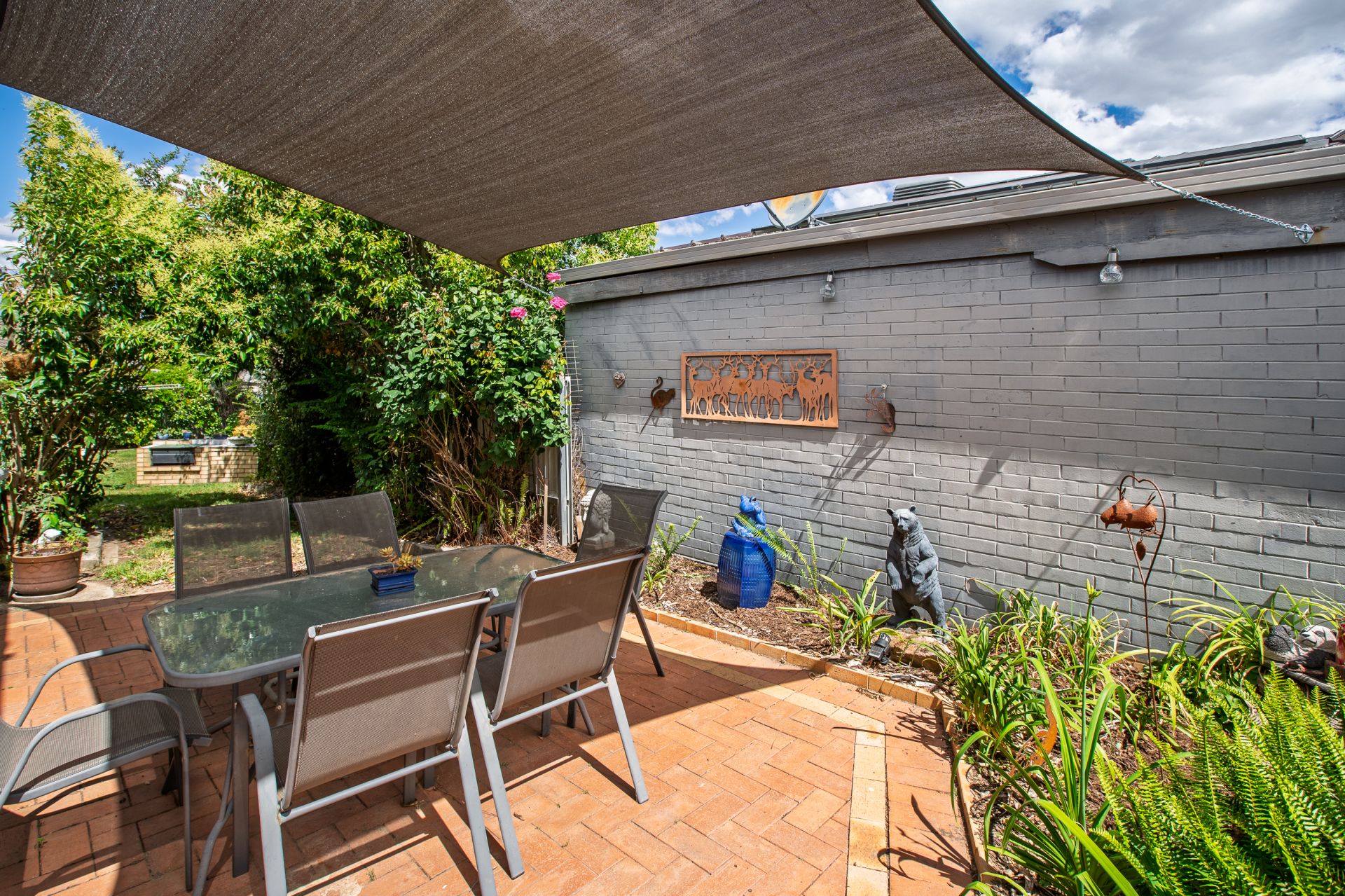 - Paved entertaining area with shade sail