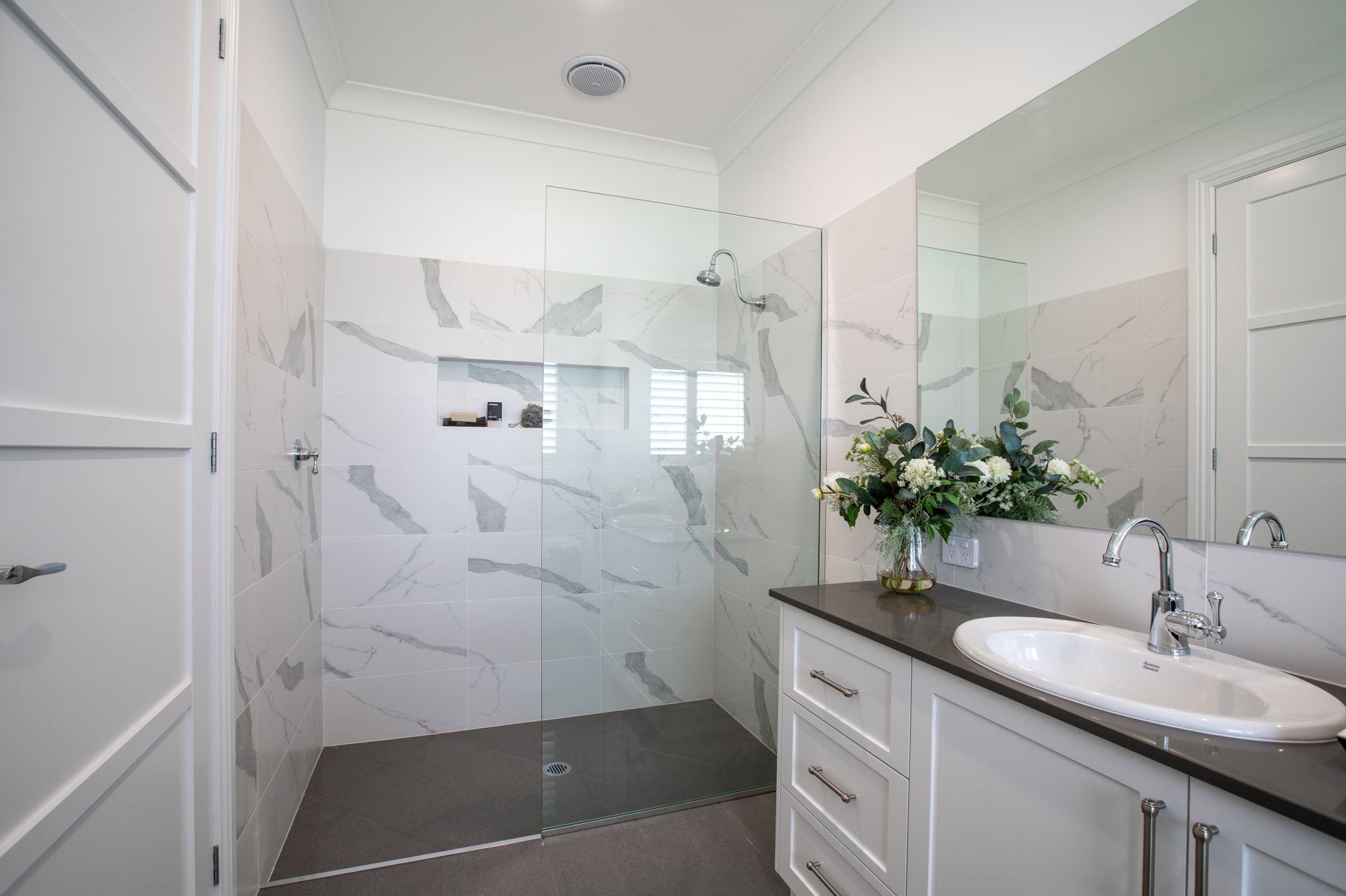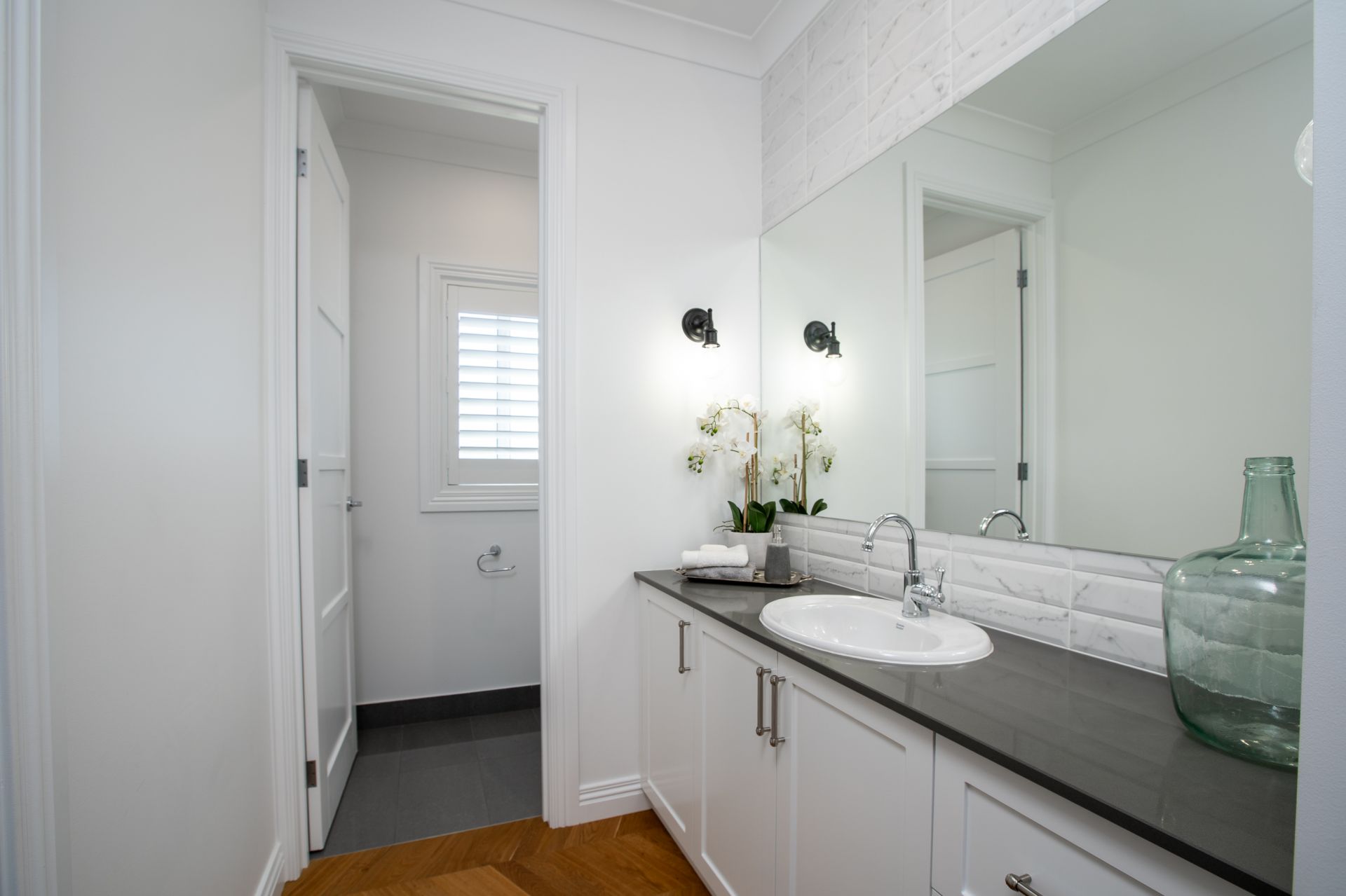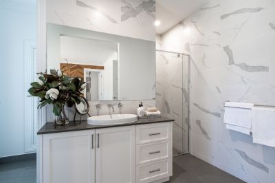 - Powder-style bathroom with stone bench tops, walk-in shower and a separate toilet