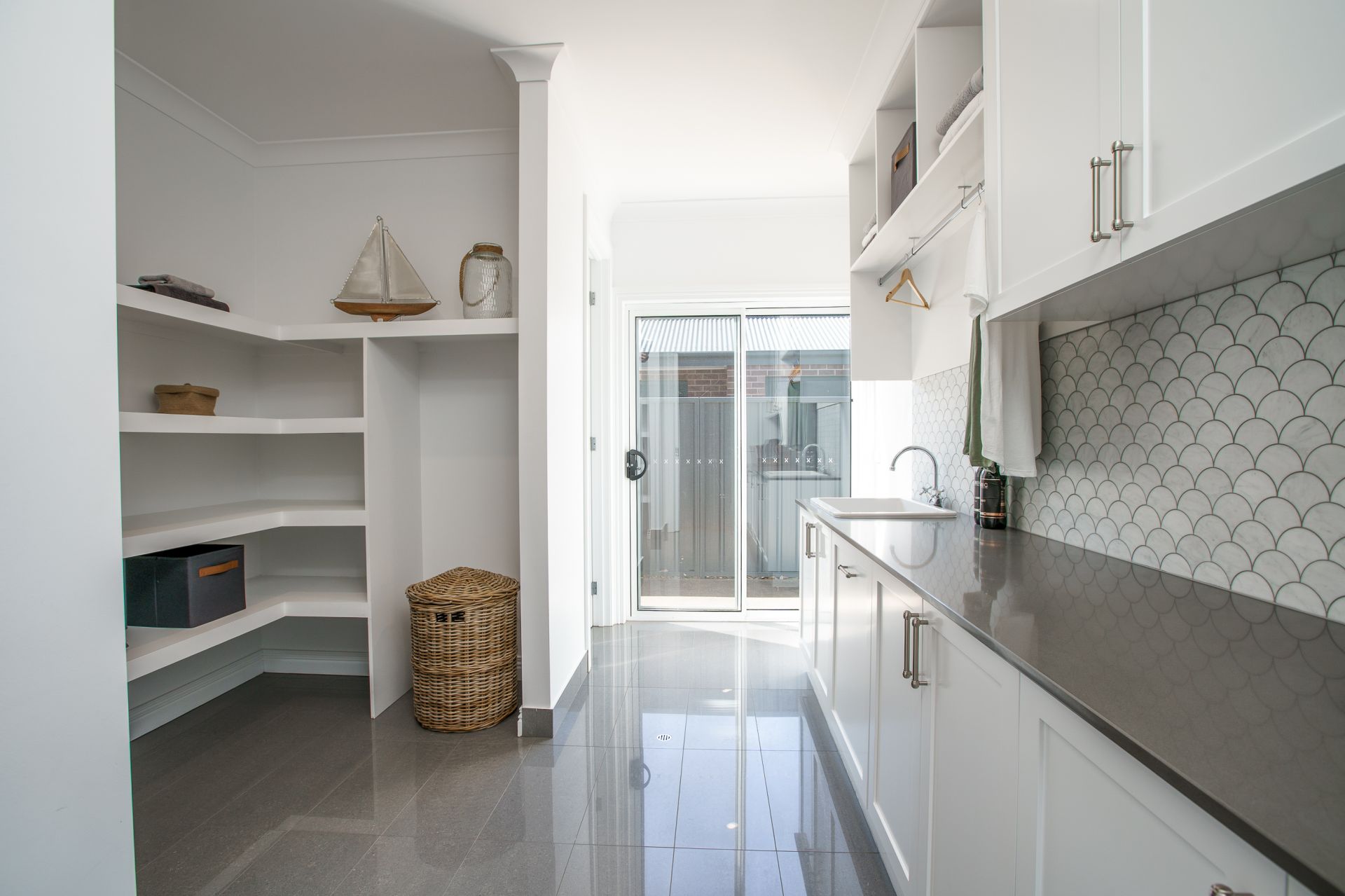 - Spacious laundry with stone bench tops, full-length bench, overhead cupboards, walk-in linen and a separate toilet