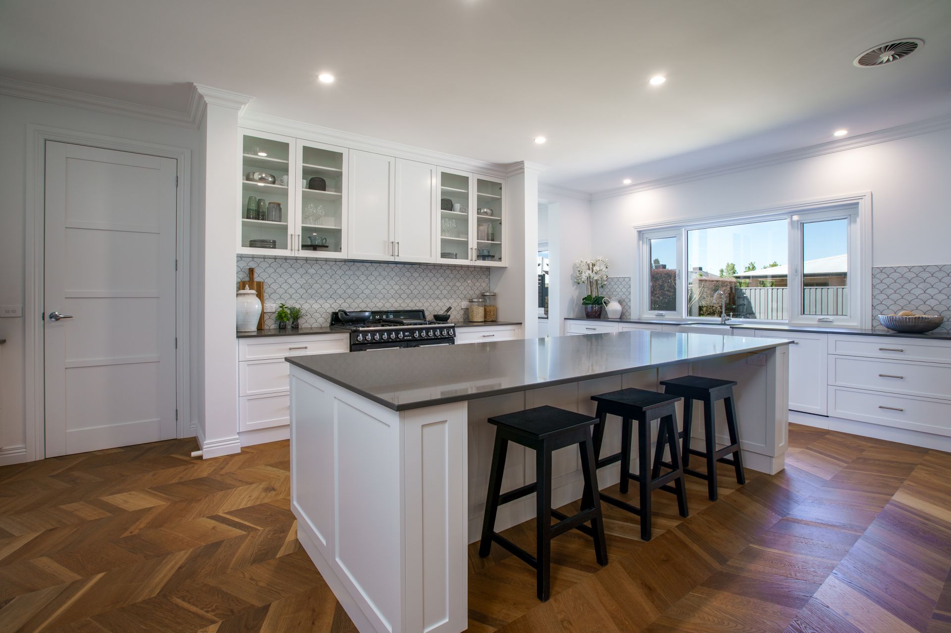 - Kitchen is complete with stone bench tops, Smeg 7-burner gas stove, double oven, dishwasher, and butler's pantry