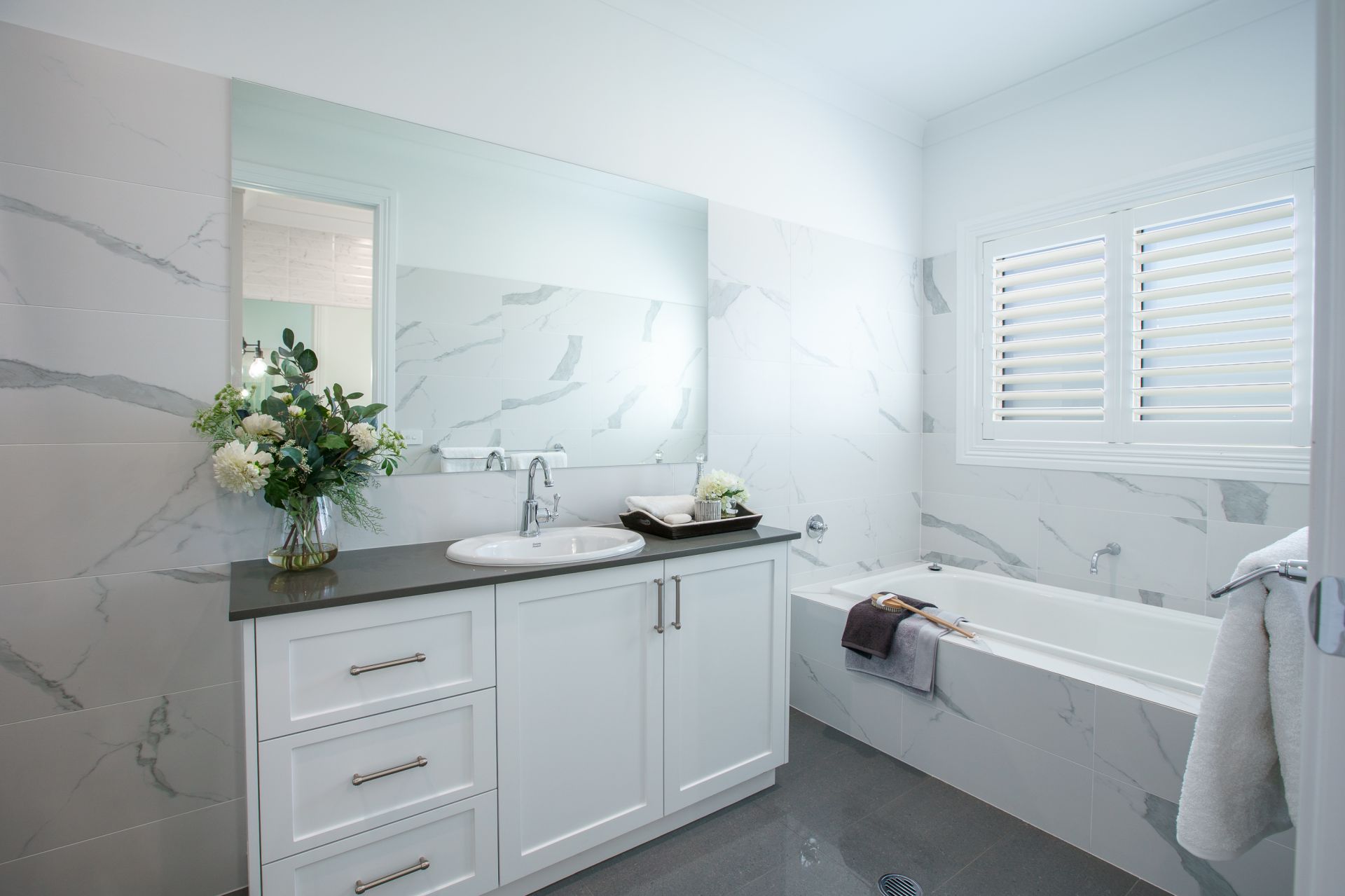 - Master bedroom with bay window seating, walk-in robe with built-in cabinetry, ensuite with floor-to-ceiling tiles, stone bench top and a separate toilet