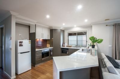 Contemporary finishes and neutral tones give the home a fresh and inviting feel. The kitchen is well-appointed with modern appliances and generous storage, creating a practical space that complements the open flow of the living areas.